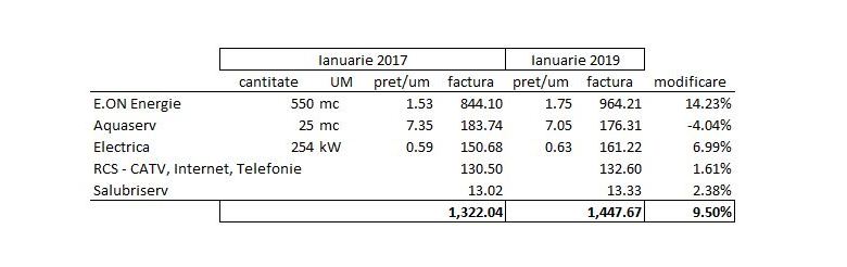 De curiozitate am refăcut experimentul lor, de data aceasta luând în calcul facturile furnizorilor mei de utilități din ianuarie 2017, respectiv ianuarie 2019. Spre surpriza mea, creșterea, pe total, nu depășește 9,5 procente. La apă/canal (furnizor Aquaserv) am avut chiar o scădere, datorată modificării TVA la canal menajer, de la 19% la 9%. Greu de înțeles cum au putut să se scumpească, în doi ani, produsele hypermarket-ului cu 50% în condițiile în care utilitățile s-au majorat cu doar 10%. Ce reprezintă diferența de 40%?